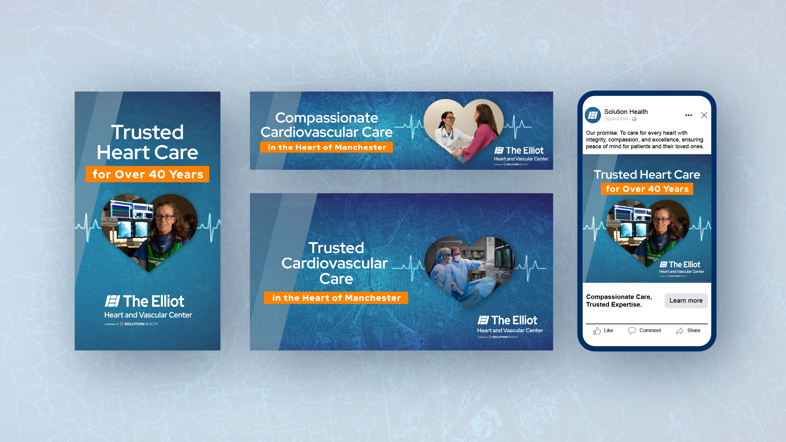 After finalizing the creative, we launched a multi channel campaign to bring our message into the daily lives of the community. Spanning digital, billboard, and transit placements, the goal was to make The Elliot’s commitment to trusted heart care visible, memorable, and deeply felt throughout Manchester and the surrounding area.